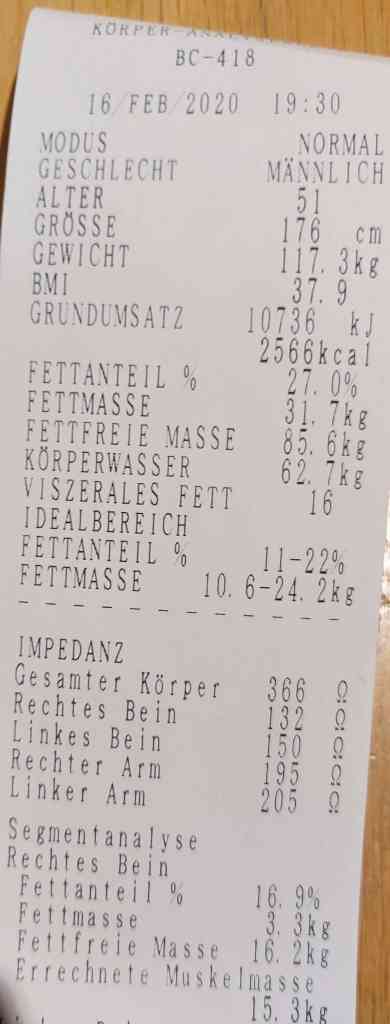 Today workout and new scale Weighted myself on the scale at the fitness. The results are completely different from my scale. In particular, the body fat isn’t 37% but 27% as per the fitness scale. The weight was accurate. Bought myself another scale. It give 27% fat as well, confirming the fitness scale. Below, the print out from the fitness scale, and the result from the new scale.