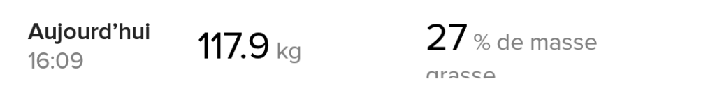Also, gained +0.6% of muscles in the last 7 days. Probably 1% since day 1. And 1% of 119.2 kg, the initial weight, still represent 1.2 kg of muscles gained, while my weight dropped by 1.9 kg. That’s a 3.1 kg of fat dropped at the end which is not bad.