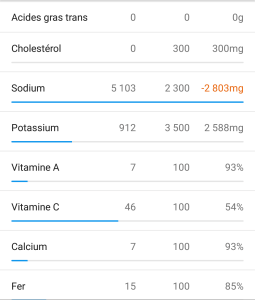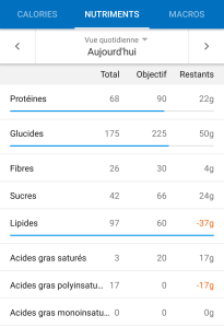 Interesting: it shows 22g of proteins are missing, glucides and sugar as well, which I don’t care, but also, too much polyunsaturated fat and sodium (salt).